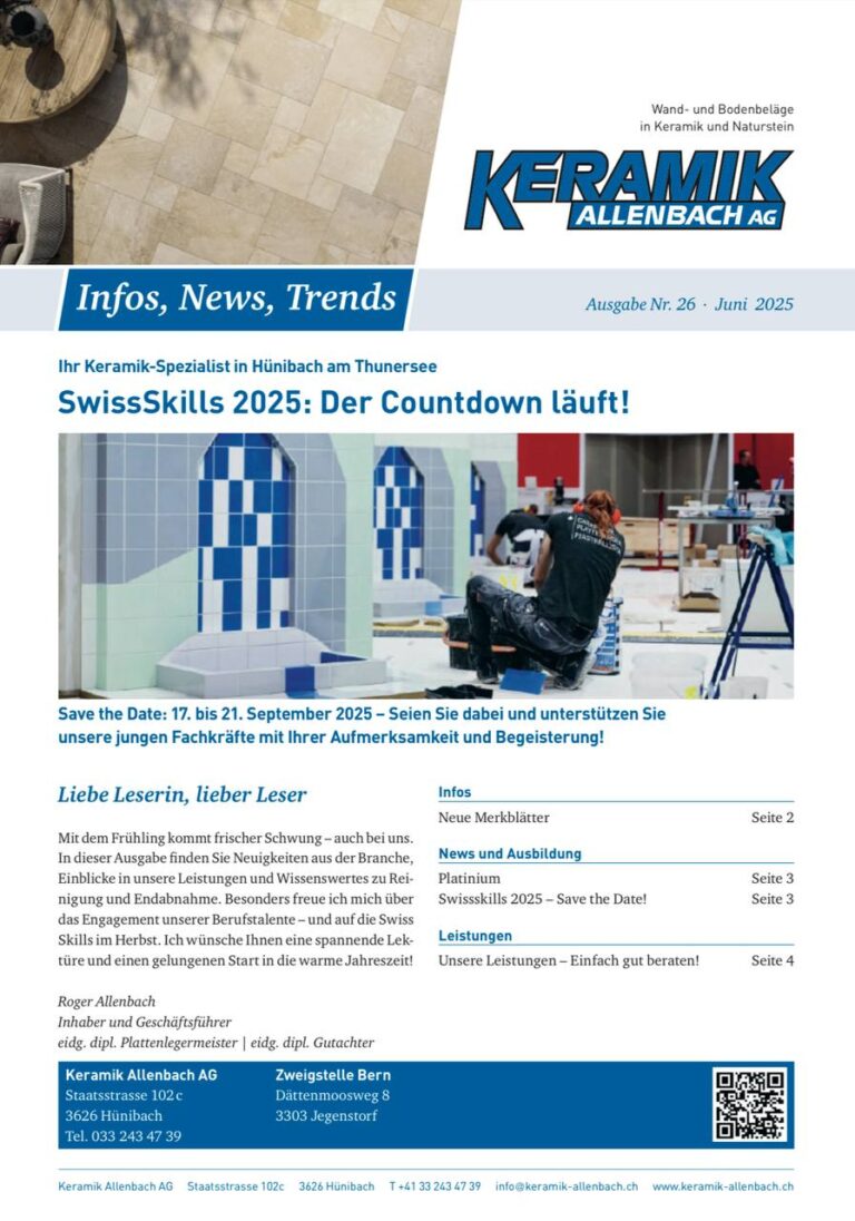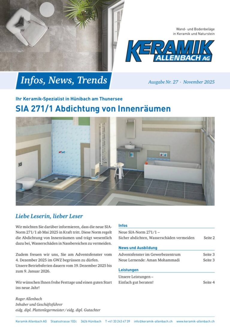 Wir heissen Sie herzlich in unserer aktuellen Ausgabe willkommen. Unsere Zeitung präsentiert relevante Nachrichten, spannende Geschichten und Einblicke in verschiedene Themenbereiche der Plattenleger-Branche. Ermutigen Sie sich, diese Ausgabe zu erkunden, um fundierte Informationen und Inspiration zu finden. Ihr Feedback ist uns wichtig und wird geschätzt. Vielen Dank für Ihre Unterstützung.